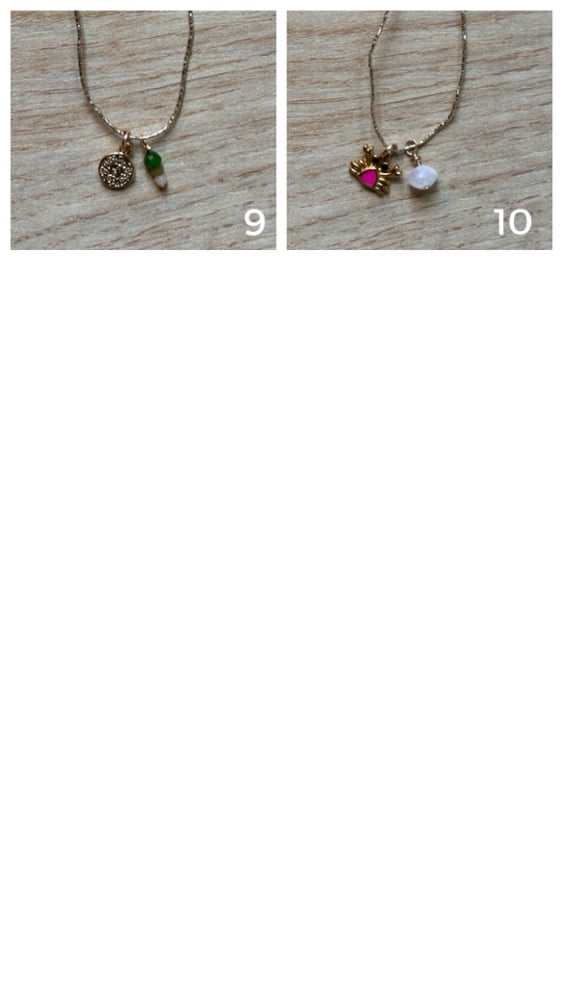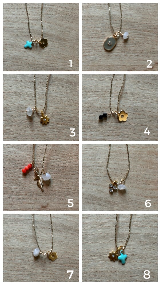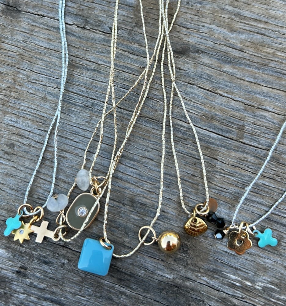 * Mini grigris ( perles, gold filled and charms ) with elastic golden cord.